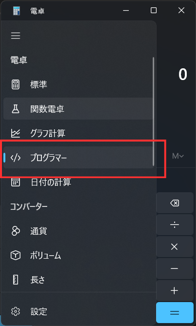 電卓を起動し、左上の三本線をクリックし、下記の「</> プログラマー」を選択します。