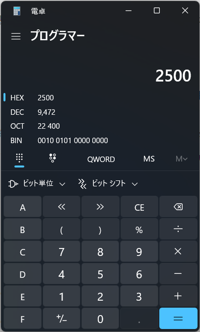 例:BCD「2500」のバイナリー・2進数の値を知りたい場合