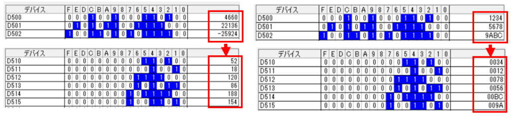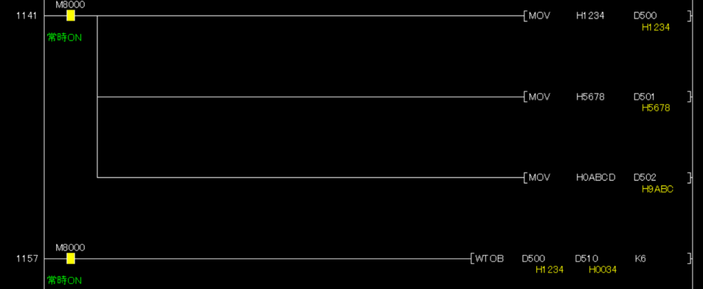 例えば、[WTOB D0 D10 K2]の場合で、D0に16進で「1234」という数字が入っていると、