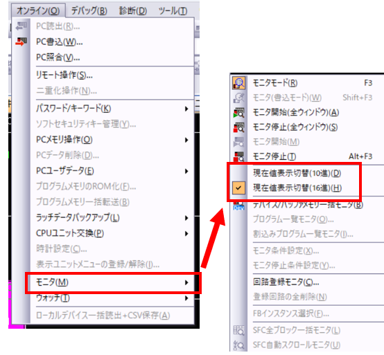 2.三菱GX Woks 2 のレジスタモニタの表記を10進から16進に変更する方法