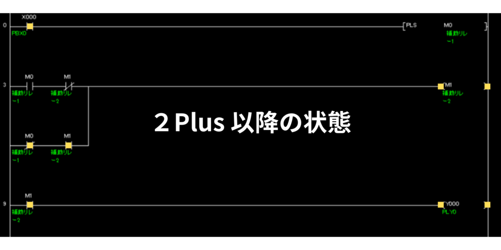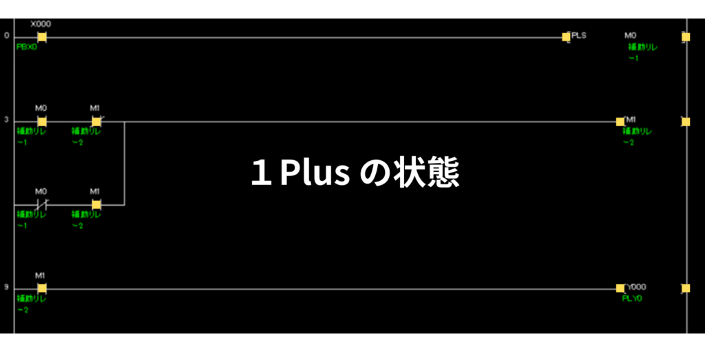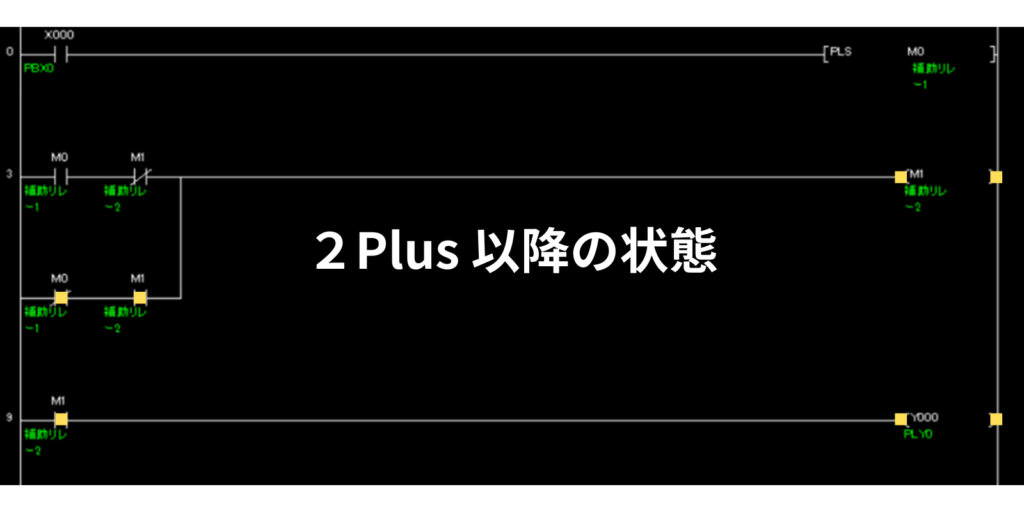 PLS命令は1パルスしかONしないので、2パルス目以降は、M0はOFFします。よって、2パルス目は、M1コイルの左側条件の下の「M0 b接点+M1 a接点」ラインで、M1がONします。