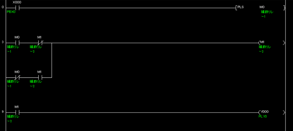 一つのボタンでオンオフするラダー回路を、パルスの回数ごとにラダー回路にて、説明します。