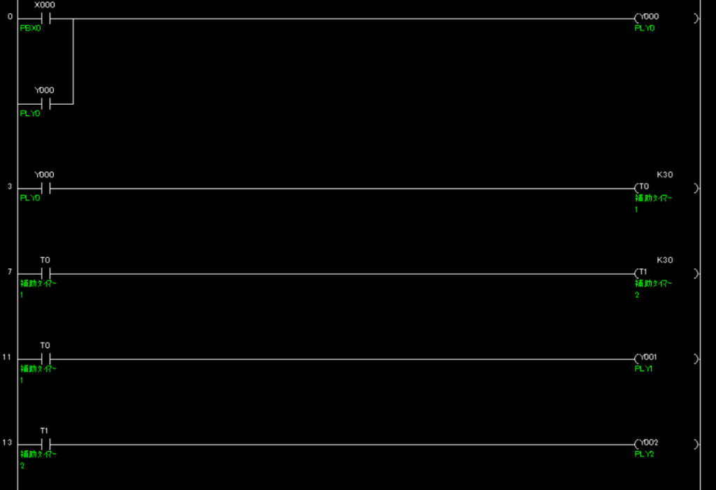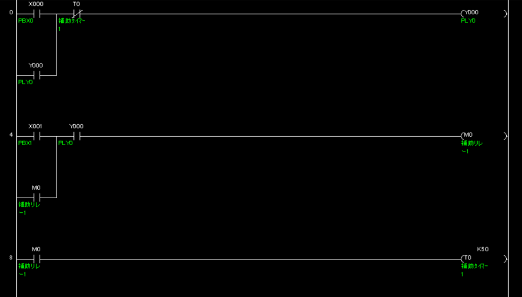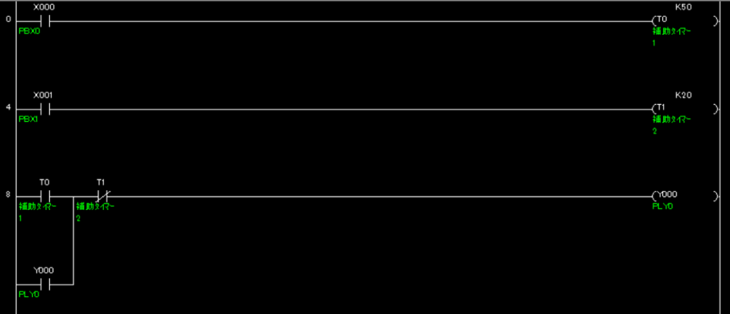 ・X0とY0のa接点のOR回路と、T0のb接点をAND回路にし、Y0のコイルと繋ぎます。