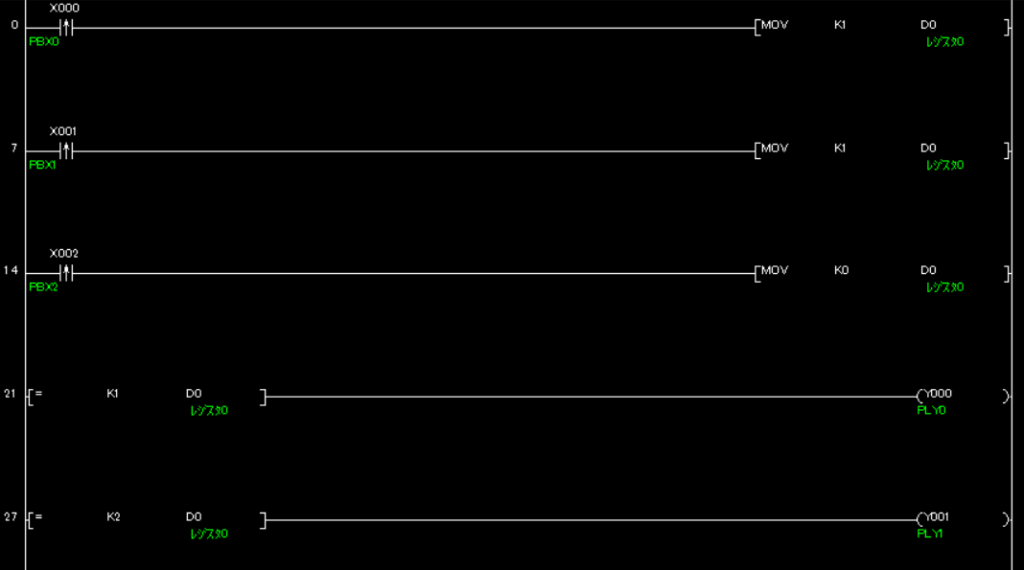 前提条件 PLC型式:FX3S-10MR/ES 入力X0:PBX0 押しボタン1(緑)X1:PBX1 押しボタン2(緑)X2:PBX2 押しボタン3(赤)X3:PBX3 押しボタン4(赤)X4:SSW-X4 セレクトス…