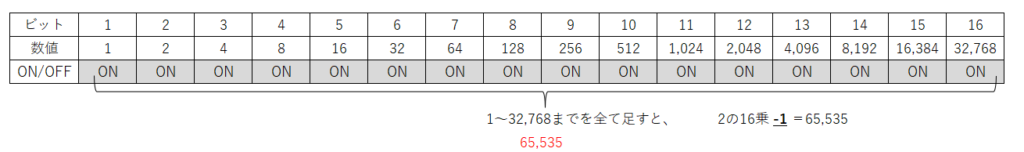 1ワードは16ビットの為、16ビットが全部ONしている状態が最大値となりまる。