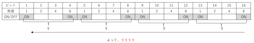 次に、1ワードのBCDの最大値は、「9999」となり、下のようになります。